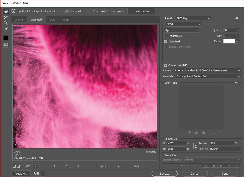 Save for Web هي الأداة الكلاسيكية لتحسين الصور للويب.